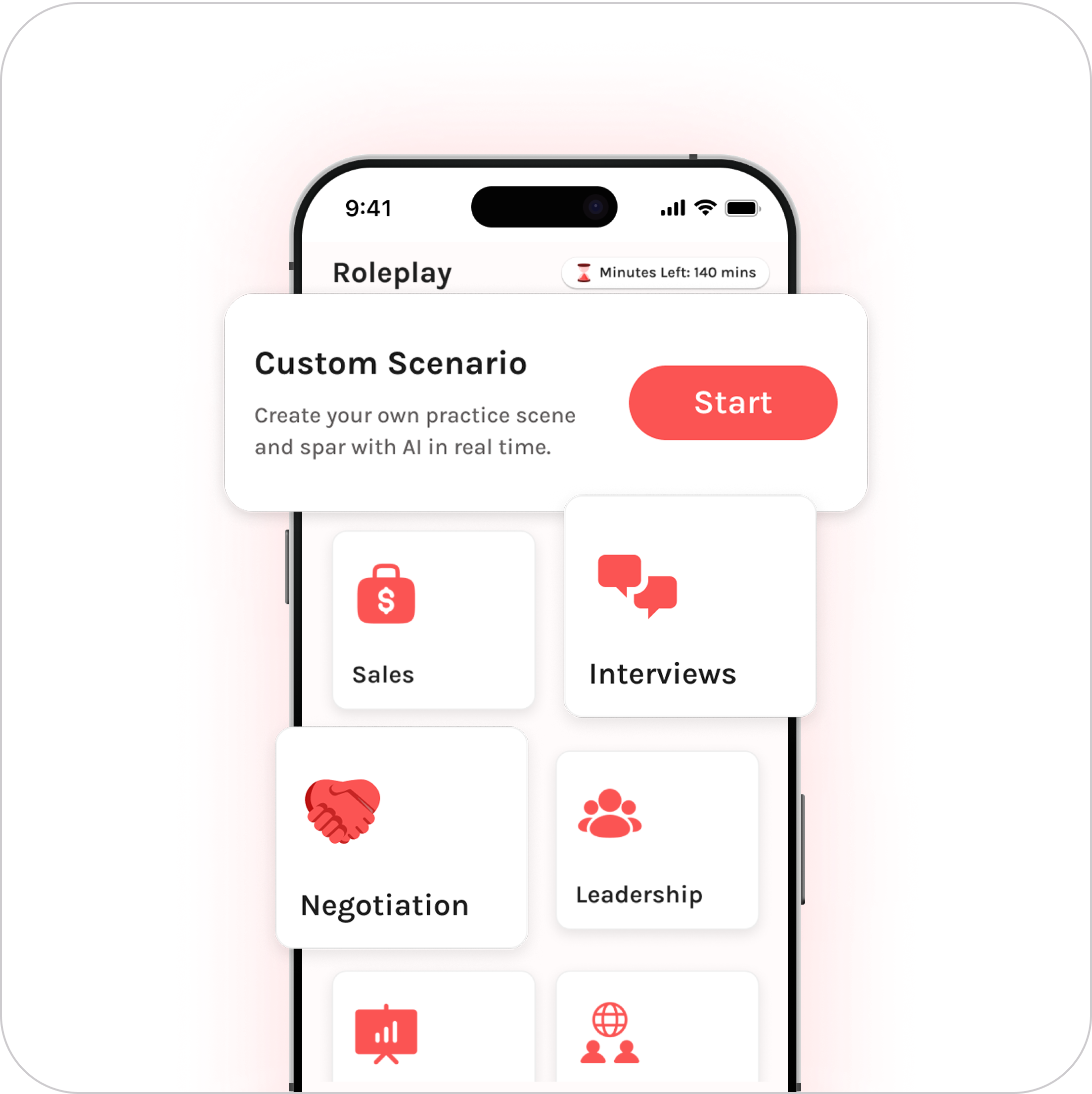 Choose from a growing library of practice topics like interviews, sales, and leadership, or create your own custom scenario. Every drill helps you rehearse the moments that matter most in a realistic, structured way.